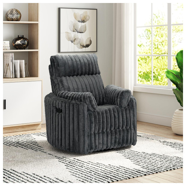Indulge in relaxation with the Avenida Gunmetal Swivel Recliner, a perfect blend of cozy luxury and functional design. Upholstered in a soft, plush fabric with a chic ribbed texture, this recliner invites you to unwind in style. The versatile gunmetal hue complements a variety of décor styles, making it a standout addition to your living space.
