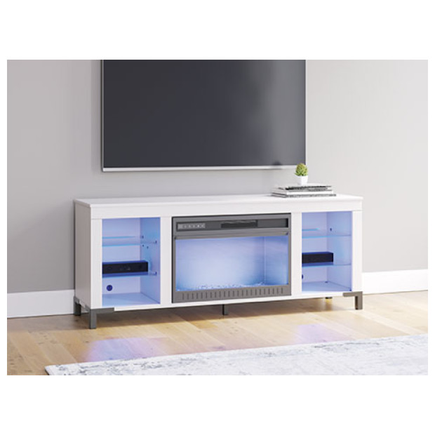 Level up your gaming experience and make movie nights to remember. This TV stand with electric fireplace extends your entertainment beyond the screen. Its built-in fireplace brings the heat, synchronizing with LED backlighting on the shelves. And you can customize the vibe with three trendy color options: blue, white and red. Modern function. Captivating, cool style. With this TV stand, revamp your home’s recreational hub like never before.