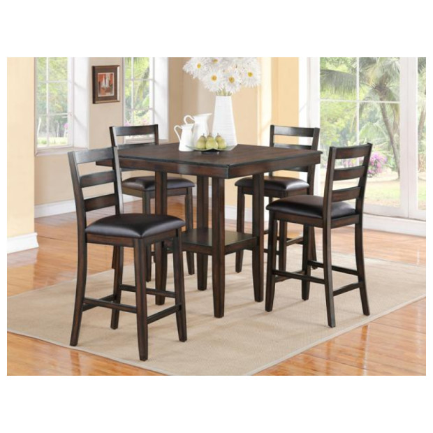 This dining room set is a perfect addition to a casual dining area. The set is finished in espresso and the stools are comfortably upholstered. With a handsome brown finish and a simple, clean design, this dining set is perfect for a casual dining area.