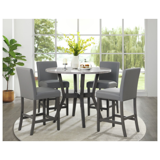A beautiful 5PC Counter Dining Set that brings a simple, elegant look to your dining area. It features a faux marble tabletop accenting its round shape that is perfect for smaller spaces. It comes with four smooth, upholstered counter chairs in a brushed grey PU fabric that will be a breeze to clean up. Chairs also include four stretchers for extra stability, while no arms make it easy to come and go. Overall, a clean, modern dining set that is fit to host your family and friends any day of the week.