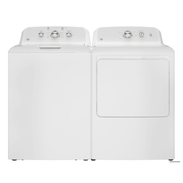GE washer has 4.3cf capacity with water level control and dual-action agitator. GE dryer has 7.2cf capacity with auto dry technology, powerful venting and reversible door.